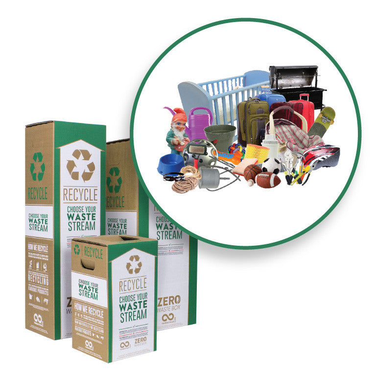 Use this Zero Waste Box to recycle non-recyclable and non-organic waste that is generated in your garage and outdoor areas. This includes automotive parts, baby gear, filters, garden products, home improvement, storage containers, luggage and travel bags, outdoor furnishings, paper packaging, pet products (non-food), plastic packaging, shipping materials, and sporting goods.