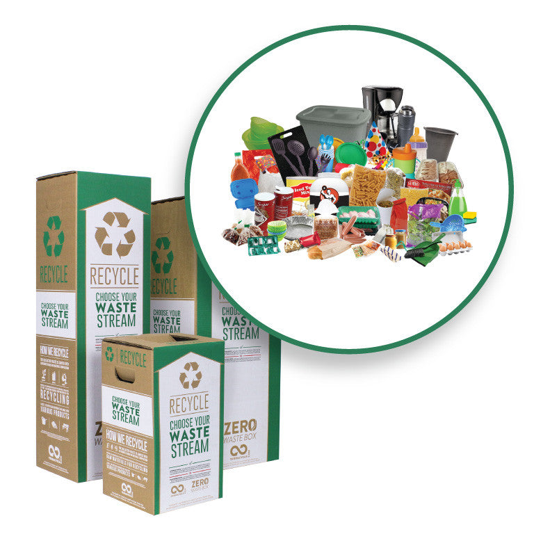 Use this Zero Waste Box to recycle non-recyclable and non-organic waste that is generated in the kitchen. This includes plastic packaging, paper packaging, kitchen gear, baby gear, filters, cleaning accessories, coffee and tea accessories, party supplies and dining disposables, interior home furnishings, coffee discs, prescription drug packaging, and fabrics and clothing.